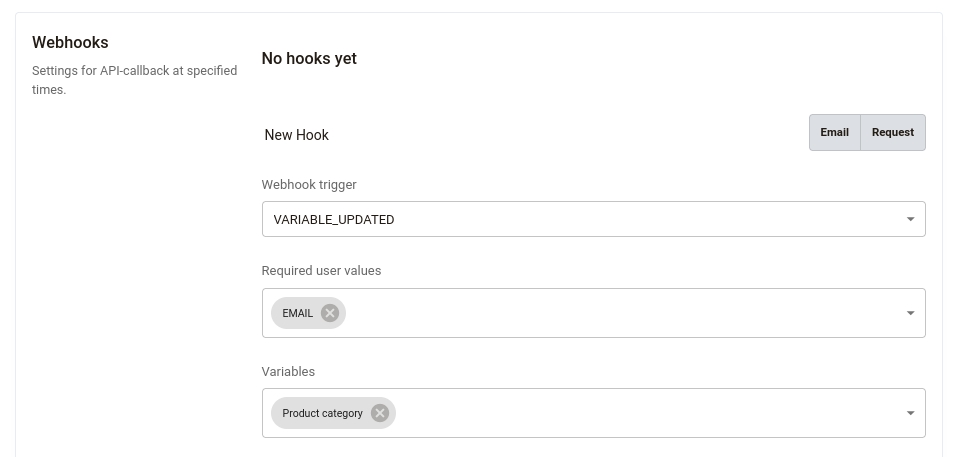 VARIABLE_UPDATEDis triggered when a user sets or updates a variable, you also need to specify which variable(s) you want to listen to.PRODUCT_RECOMMENDATIONis triggered whenever a user receives a product recommendation.1